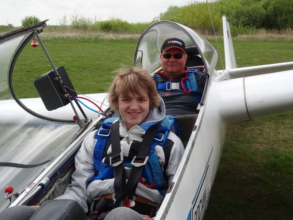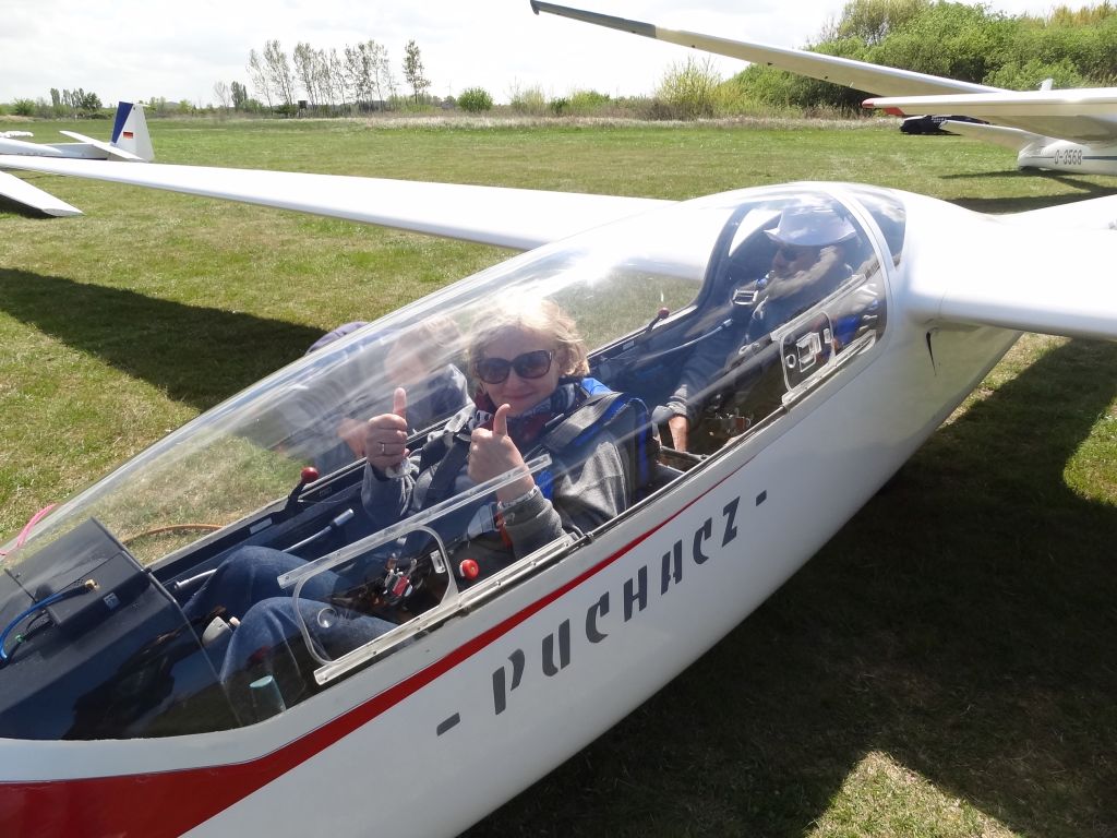 Anschließend ging es an den Start, den die Piloten des FCR in der Zwischenzeit aufgebaut hatten. Zwei Segelflugzeuge vom Typ „Puchacz“ und zwei „Bociane“ standen bereit. Angesichts der Aussicht auf baldiges „Abheben“ machte sich langsam Aufregung unter den Teilnehmern breit. Dann hieß es: „Einsteigen und anschnallen bitte!“. Unter fachkundiger Anleitung durch den jeweiligen Fluglehrer nahmen die Gäste auf dem vorderen Sitz Platz – was sonst nur Flugschülern oder Lizenzpiloten vorbehalten ist. Ein erstes Vertrautmachen mit den Bordinstrumenten, ein letztes Winken den fleißig fotografierenden Angehörigen – dann ging es hoch in die Luft, gezogen von einer PS-starken Winde. Sehnsüchtig, aber vielleicht auch ein bisschen ängstlich, schauten die am Boden gebliebenen „Piloten“ hinterher.