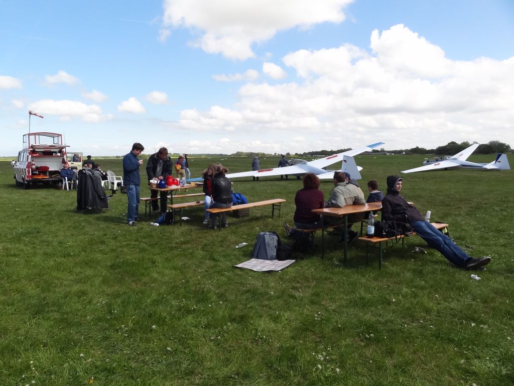 Obwohl die Wetteraussichten für den Tag nicht besonders rosig waren, lugte schon beim morgendlichen Briefing die Sonne hinter den Wolken hervor, was nicht zuletzt zur guten Stimmung unter den Gästen und zahlreich erschienenen Vereinsmitgliedern beitrug. Nach einer kurzen Einweisung in den Ablauf des Flugbetriebes erhielten die elf „Piloten für einen Tag“ eine theoretische Einführung in die Technik des Fliegens und zu weiteren Themen, das Segelfliegen betreffend.