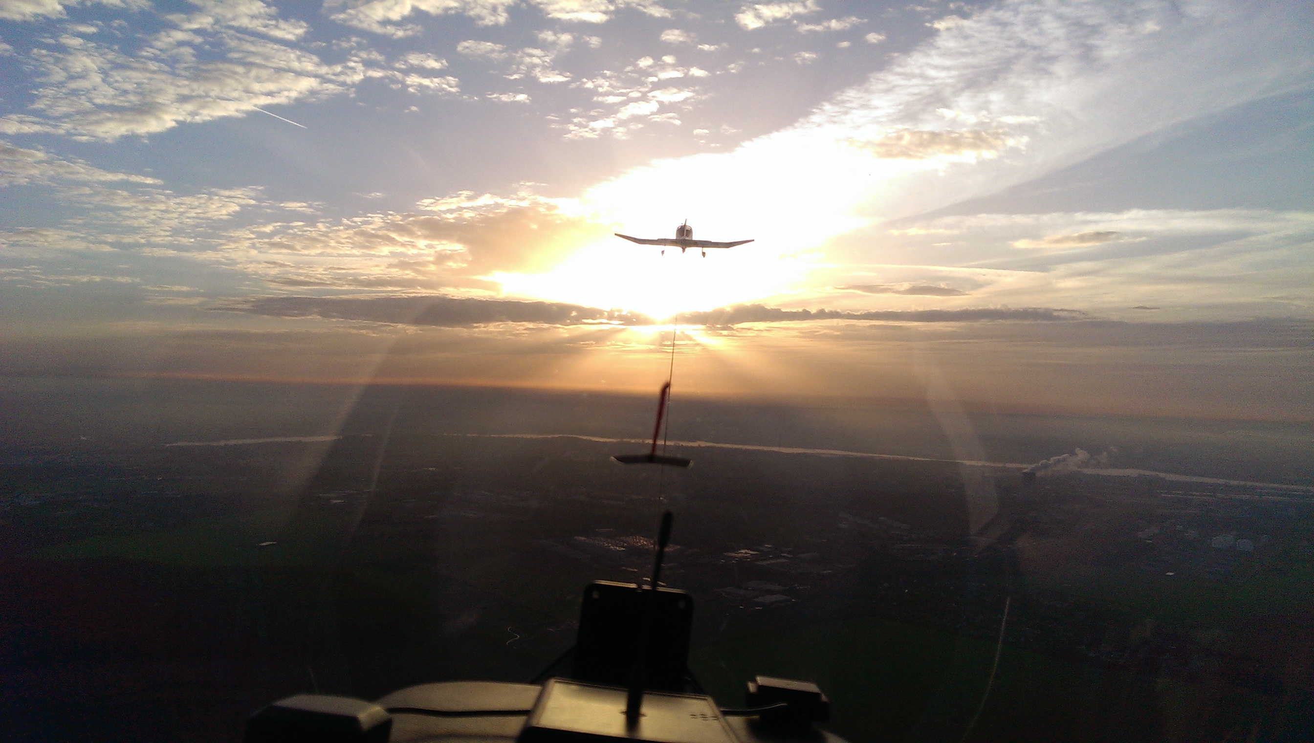 In der Remorqueur und der DG 101 dem Spiel der Farben entgegen – immer wieder nutzen Vereinsmitglieder die Möglichkeit, auch nach dem offiziellen Abfliegen „in die Luft zu gehen“, um die herbstlich bunte Landschaft und mit viel Glück solch schöne Sonnenuntergänge zu airleben.