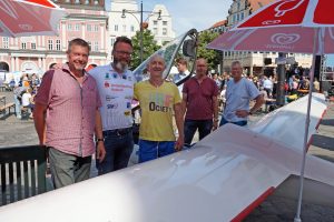 Am 24. Juni feierte die Hansestadt Rostock auf dem Neuen Markt das 801. Stadtjubiläum. Auf einer großen Bühne wurde ein buntes Programm präsentiert. Drumherum hatten Rostocker Vereine und Organisationen die Gelegenheit, sich vorzustellen. Diese Chance konnten sich die Rostocker Flieger nicht entgehen lassen. Sie stellten ein Segelflugzeug DG-101 ELAN aus. Jeder konnte sich über den Verein informieren, probesitzen und natürlich auch Fotos machen. Das Interesse war groß, immerhin steht nicht jeden Tag ein echtes Flugzeug im Herzen von Rostock. Sogar der frisch gewählte neue Bürgermeister Claus Ruhe Madsen stattete den Rostocker Fliegern einen Besuch ab.