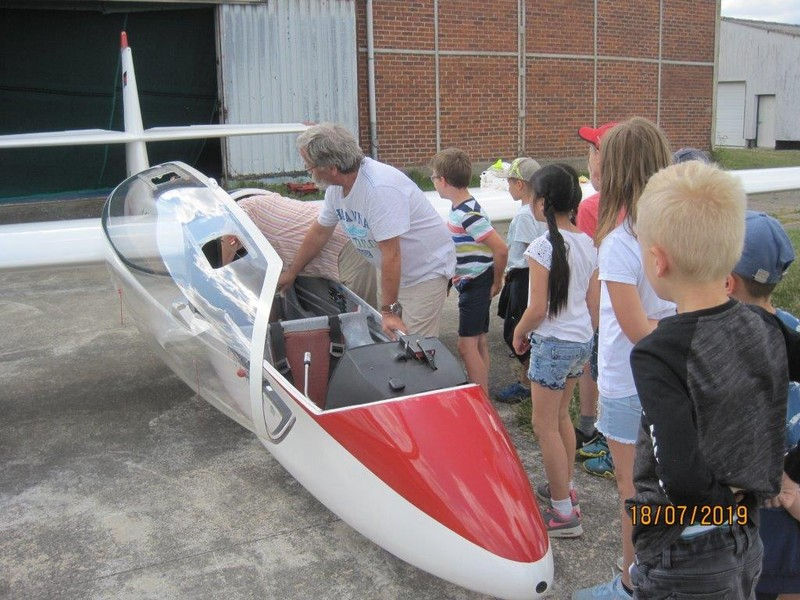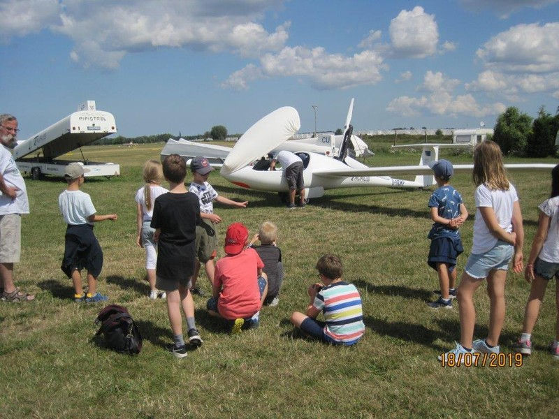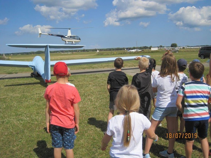 Nach einer kleinen Theoriestunde ging es zu den Flugzeugen. Da sich das Wetter von seiner besten Seite zeigte, konnte ein Segelflugzeug aus der Halle geholt, bestaunt und angefasst werden. Wer wollte, durfte sogar auf dem Pilotensitz Platz nehmen. Auch in der Luft gab es einiges zu hören und zu sehen. Startende und landende Flugzeuge sowie ein fast auf der Stelle schwebender Helikopter begeisterten die kleinen Zuschauer.