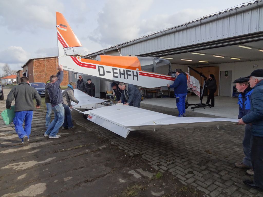 Weit mehr als 500 Arbeitsstunden kamen so zusammen. Nachdem auch die letzte Schraube wieder ihren angestammten Platz bekommen hatte und die Remo somit bereit zum Aufrüsten war, fassten viele kräftige Hände mit an, um die D-EHFH, so die Kennung des Fliegers, wieder vollständig zusammenzusetzen.