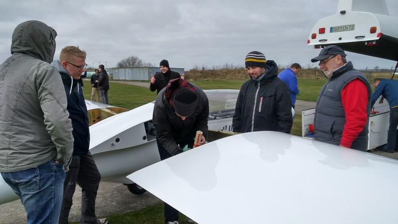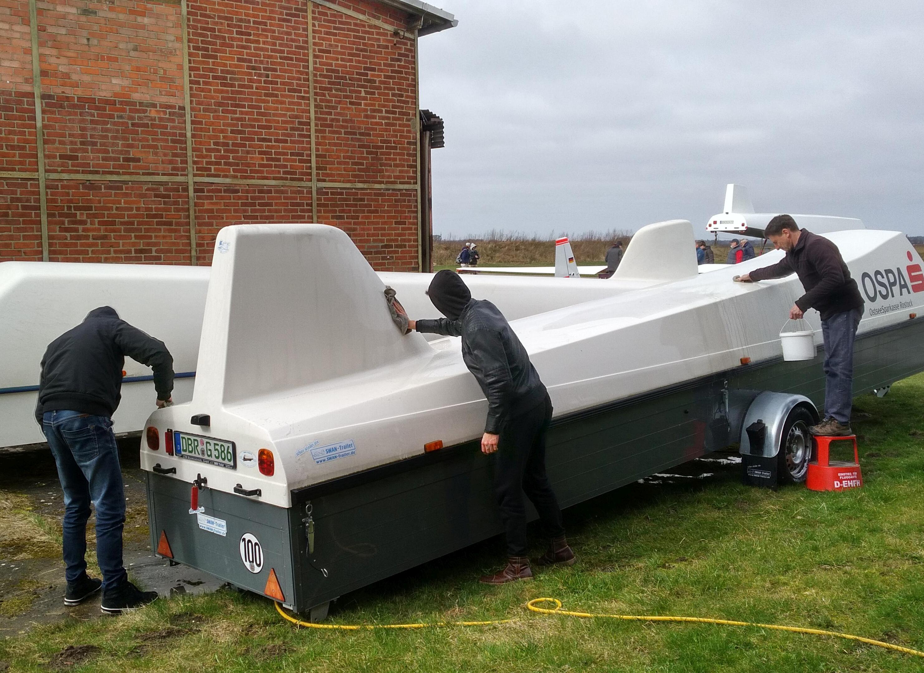 Bevor es am nächsten Wochenende wieder losgeht mit dem Segelflug, trafen sich heute die Pilotinnen und Piloten des FCR, um sich beim obligatorischen Jahresbriefing über Wissenswertes zum Ablauf der kommenden Flugsaison zu informieren. Neben gesetzlichen Vorschriften und Vereinsregelungen ging es auch um die Sicherheit auf dem Flugplatz. Anschließend halfen alle mit, die Segelflugzeuge „zusammenzustecken“, was bedeutet, dass die Tragflächen und das Leitwerk am Flugzeugrumpf befestigt werden. Die Anhänger bekamen eine ordentliche Wäsche und auch die Flugplatzfahrzeuge wurden ein letztes Mal gecheckt. Nun ist alles vorbereitet für das offizielle Anfliegen am 1.4.2017. Hoffen wir, dass das Wetter uns dabei keinen (April)Scherz spielt.