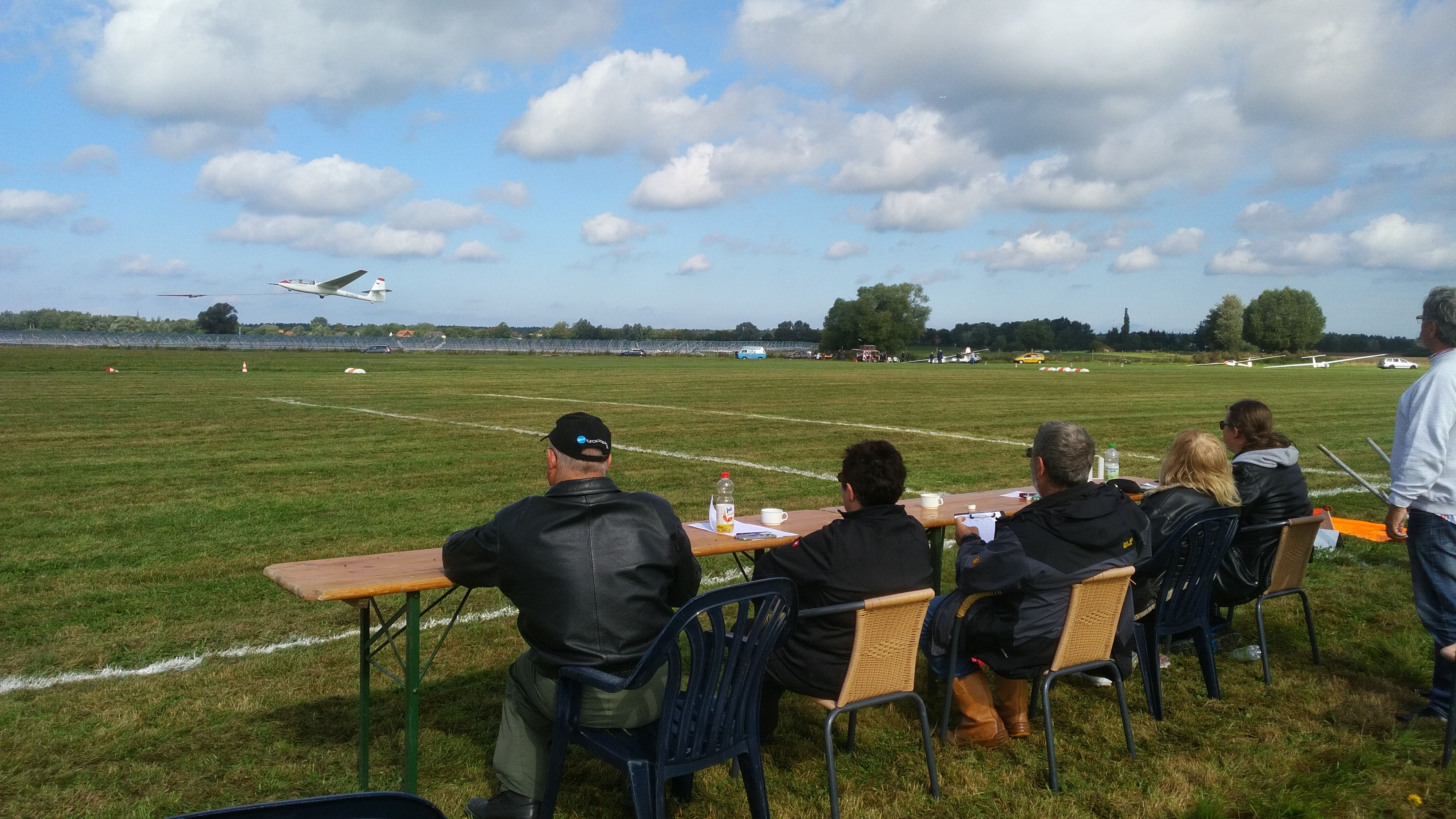 Dann wurde es ernst. Im ersten Wertungsdurchgang waren Kreiswechselflüge zu zeigen. Die am Lande-T sitzende Jury schaute ganz genau hin und vergab Minuspunkte für Fehler, lobte aber auch besonders gut gelungene Flugübungen. Die Piloten verfolgten ebenso aufmerksam die Platzrunden der Konkurrenz und vor allem die Landungen gaben Anlass zu so manchem Kommentar. Da das Wetter hielt, was es versprochen hatte, konnte auch ein weiterer Durchgang geflogen werden. Rollübungen und Seitengleitflug, auch „Slip“ genannt, standen nun auf dem Programm. Die Piloten schlugen sich gut und zeigten, was sie bei ihren Fluglehrern gelernt hatten. Nach einer kurzen Mittagspause entschied man sich aufgrund der vorangeschrittenen Zeit, keinen dritten Durchgang mehr zu fliegen. Der Wettkampf war aber trotzdem noch nicht zu Ende. Im Gegenteil, er wurde jetzt noch einmal so richtig spannend, denn die zwischenzeitlich erfolgte Punkteauszählung hatte ergeben, dass in der Einsitzerklasse zwei Piloten mit gleicher Punktzahl auf dem ersten Platz lagen. Ein Stechen musste her. Die hochgezogene Fahrtkurve, eines der beim Bundesjugendvergleichsfliegen in zwei Wochen zu zeigenden Flugelelemente, sollte über den Sieg entscheiden.
