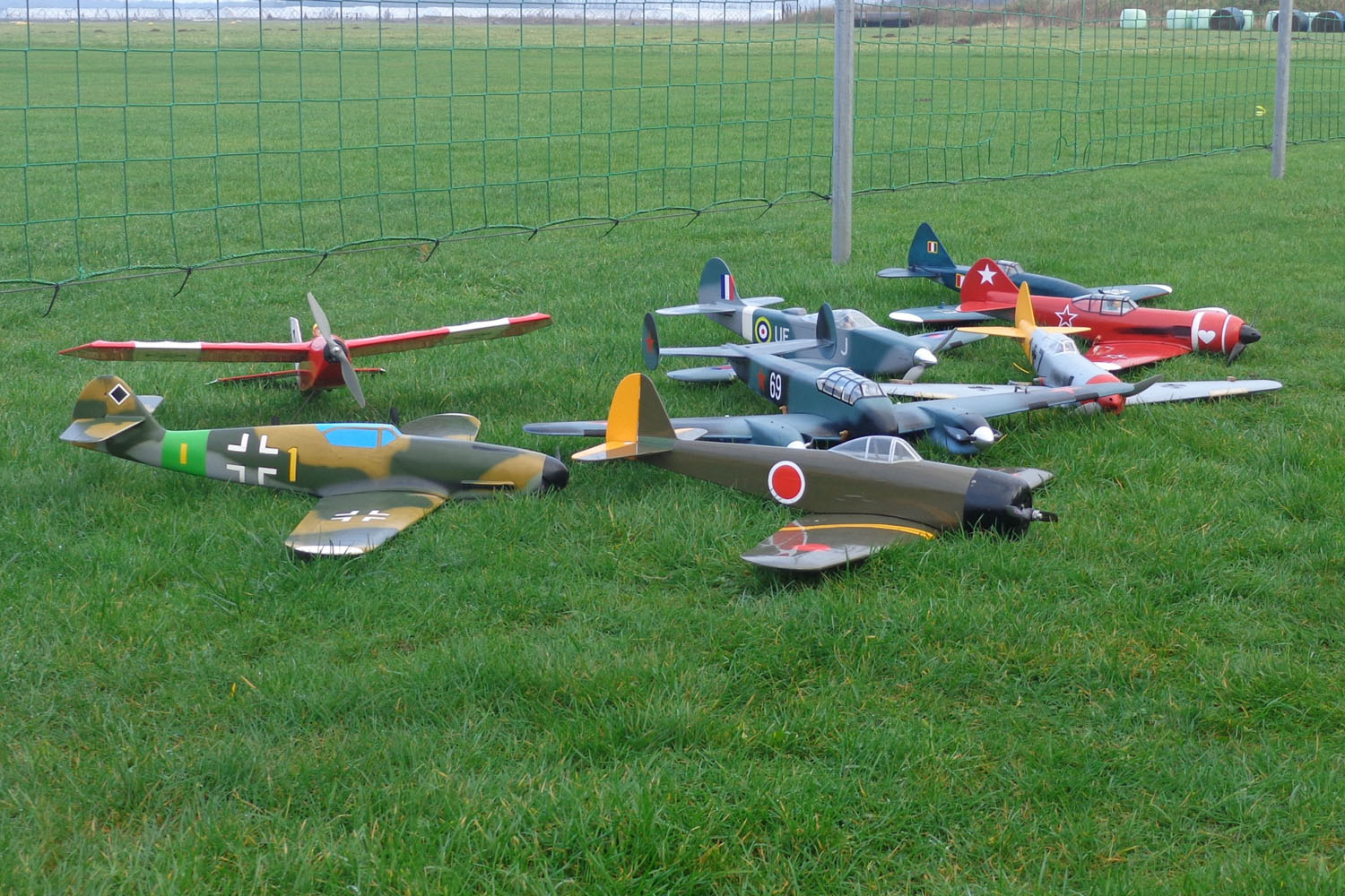 Verschiedene Flugmodelle (Me 109, P-39 „Airacobra“, Yak-4, La-7, Ki-43 „Hayabusa“, Reggiane Re 2005), alle etwa im Maßstab 1/12