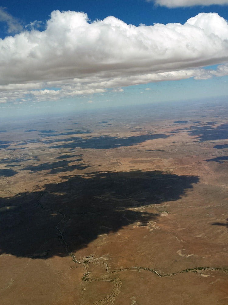 Die ersten Tage brachten aufgrund der hohen Feuchtigkeit nur „kleine“ Strecken. Aber die Thermik und Basishöhen wurden von Tag zu Tag besser. Am 29.12. sind wir wieder ganz gemütlich als vorletztes Flugzeug gestartet. Der erste Bart brachte uns gleich auf über 3.500 m MSL, so dass wir in Richtung Gebirge im Westen und zur Namibwüste geflogen sind. Dort stand eine Konvergenzlinie. Dieser konnten wir über 200 km in Richtung Süden folgen. Beim Rückflug nach Norden brauchten wir für die 286 km nur einmal kurbeln. Da merkten wir, dass heute ein „Tausender“ für uns drin sein könnte. Der Zielanflug über 186 km war dann etwas nervenaufreibend, der Rechner zeigte öfter eine Anflughöhe unter 50 m. Rechtzeitig zum Sonnenuntergang sind wir dann durchgeschwitzt, aber glücklich gelandet. In den nächsten Tagen haben wir auch noch super Flüge mit Basishöhen bis 5.000 m erlebt.