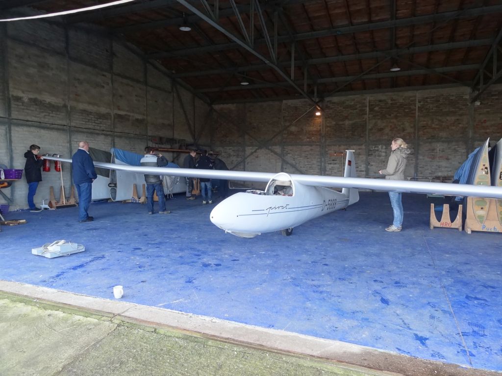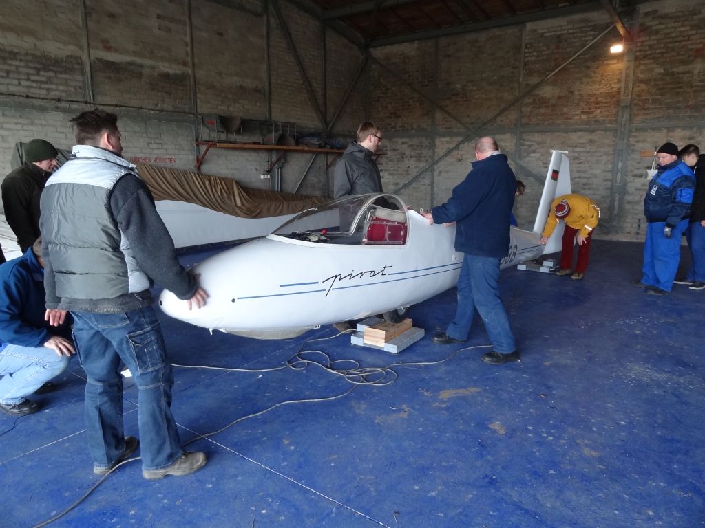 Bevor in 2 Monaten die Pilotinnen und Piloten des FCR wieder gen Himmel starten, werden im Verein derzeit letzte Wartungs- und Kontrollarbeiten an der Flug- und Fahrzeugtechnik vorgenommen. Dazu gehört unter anderem das alljährliche Wiegen der Segel- und Motorflugzeuge. So fanden sich am 8. Februar zahlreiche Mitglieder auf dem Flugplatz ein, um unter fachkundiger Anleitung durch den Werkstattleiter Maik das Gewicht der Flugzeugteile zu ermitteln und in den Akten festzuhalten. Bei schönstem Sonnenschein, der Lust auf Frühling machte, wurde das Segelflugzeug vom Typ „Pirat“ schon einmal komplett „zusammengesteckt“. Und ein Flugschüler äußerte das, was sicher viele dachten: „Hoffentlich geht es bald wieder los…“