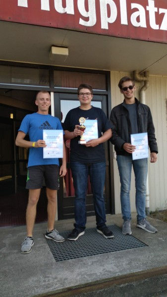 Gespannt warteten alle auf die Siegerehrung. Max Potratzki schaffte es, seinen dritten Platz aus dem letzten Jahr zu verbessern und holte sich Sieg und Pokal in der Doppelsitzerklasse. Herzlichen Glückwunsch, Max! Tom Kaufmann verpasste nur mit wenigen Punkten einen Platz auf dem Treppchen und wurde Vierter. Ivo landete im Mittelfeld. Gut gemacht, ihr drei! Sieger der Einsitzerklasse wurde Jonas Schlichting vom SFC Greifswald e.V.