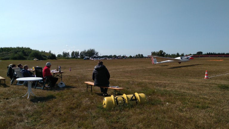 Hatte im letzten Jahr das Wetter dem Ganzen noch fast einen Strich durch die Rechnung gemacht, zeigte es sich diesmal von seiner sonnigen Seite. So konnten am Freitag wie geplant die Einweisungsstarts für die platzfremden Segelflieger stattfinden. Abends genoss man den Sonnenuntergang und sah fachsimpelnd und mit ein wenig Aufregung dem kommenden Wettkampftag entgegen.